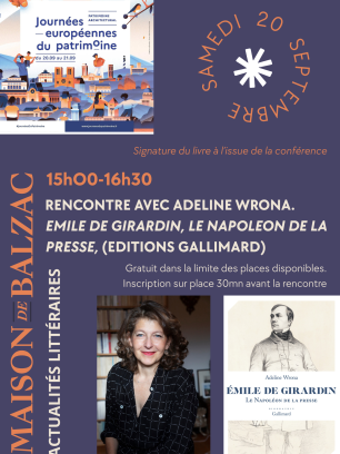 La Maison de Balzac accueille Adeline Wrona pour sa biographie d'Emile de Girardin que le musée affectionne tout particulièrement, car le fondateur de La Presse fut un ami de Balzac et ce dernier publia dans son quotidien. Nous avons rendu hommage jour pour jour, l'an passé à son épouse la journaliste et romancière Delphine de Girardin. Ils seront ainsi réunis sous le toit balzacien avec un regard affectueux et scientifique.
