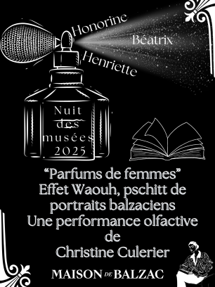 Ces trois figures ont inspiré trois parfumeurs de la Maison Givaudan. Au cours d’une performance olfactive, la comédienne Christine Culerier leur donnera voix. Vous découvrirez leurs personnalités, leurs ambiguités et leurs frustrations. Femmes corsetées dans leurs désirs enfouis, elles aiment, mais comment aiment-elles ? Plus ou moins bien, victimes des dictats, certaines se croient libres comme Honorine, mais c’est un leurre. Affamée d’amour et de conquête, sans scrupule, elles sont dévorantes et manipulatrices, comme Béatrix. Et que dire d’Henriette qui se consume à petit feu, d’avoir un adorateur qui l’idéalise et qu’elle souhaiterait plus entreprenant et moins respectueux. Si Balzac fait beaucoup parler l’âme et le cœur, le corps n’est pas en reste.