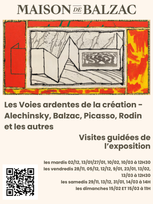 Le musée expose depuis longtemps sa méthode de travail, caractérisée par d’incessantes reprises, édition après édition, dans un désir constant de perfection que seule la mort est parvenue à interrompre. Quant à Rodin, pour son Balzac, sept années à chercher l’âme de Balzac. Tous ces artistes sont reliés par l’auteur de La Comédie humaine, soit à l’écrivain, soit à son œuvre. Picasso, aussi, travailleur et chercheur infatigable, n’a eu de cesse de reprendre le même portrait de Balzac, dessiné, gravé, sur tous les supports possibles. Quant à Alechinsky, c’est depuis trente années qu’il pioche Le Traité des excitants modernes.