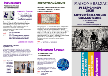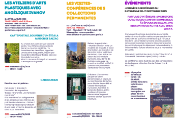 Chaque saison, le service culturel explore les liens qui unissent les arts visuels et la littérature, en proposant une programmation d'événements en dialogue direct avec l'oeuvre de Balzac, plus largement avec le XIXème siècle et jusqu'au XXIème siècle : rencontres, tables rondes, lectures, théâtre, spectacles vivants, concerts, projections de films... Inciter à la lecture, en jetant des passerelles entre les arts. Montrer comment La Comédie humaine fait écho aux préoccupations d'aujourd'hui et combien, elle est intemporelle. Place est largement offerte à la littérature et à la poésie contemporaines. Ces manifestations accompagnent et prolongent les collections et les expositions temporaires, tout en suivant le calendrier annuel des grands rendez-vous nationaux (Journée de la Femme, Printemps des Poètes, Nuit des Musées, Journées du Patrimoine ...). Une programmation d'événements gratuits et à caractère exceptionnel.