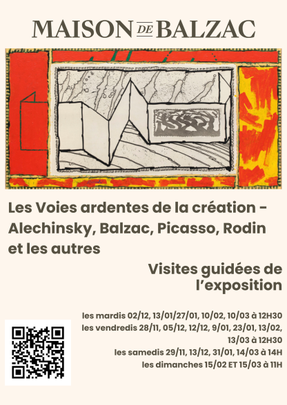 Nos guides conférencières vous accompagnent dans l’exposition « Alechinsky, Balzac, Picasso, Rodin… Les voies ardentes de la création ». Avec pour point de départ, les manuscrits de Balzac, démonstration incomparable, qu’on ne nait pas génie, mais qu’on le devient à force de travail, de lectures en relectures, de ratures en corrections, jusqu’à dix-neuf pour Illusions perdues (1843).