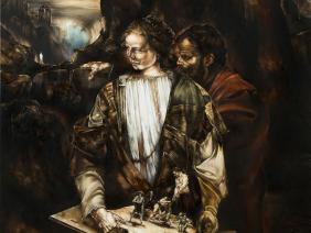 Ces lectures inspirent aussi Alkis Boutlis parce qu’elles coïncident avec sa réflexion artistique. Natif de Thessalonique où il vit aujourd’hui, il s’est tout naturellement intéressé à l’art de l’icône, dont il a étudié avec attention les modalités traditionnelles de réalisation. L’intérêt qu’il porte aux maîtres du passé est d’ailleurs l’une des composantes de son art. Ses œuvres témoignent de l’attention portée aux techniques de peinture, de sa volonté de comprendre le processus créatif d’un Rembrandt ou d’un Titien, de faire le vrai travail d’un peintre tel qu’il le conçoit.