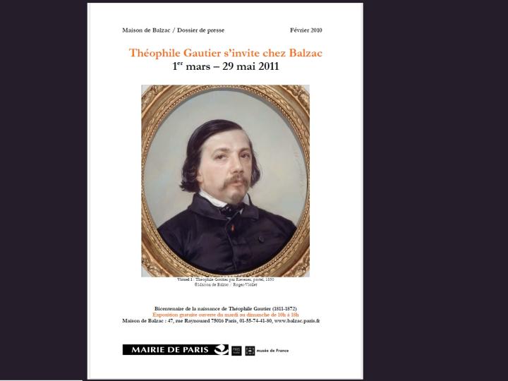 Depuis le legs Ivan Devriès, descendant de l’écrivain en 1997 ce fonds s’est enrichi par des dons provenant entre autres de la Société Théophile Gautier (un portrait de Carlotta Grisi par Gautier), mais aussi de la Société des amis de Balzac et de la maison de Balzac (un manuscrit de notes préparatoires pour Le Roman de la Momie), ou de donateurs privés (un petit déjeuner en métal argenté), ainsi que grâce à des achats (manuscrit de l’Histoire du romantisme, peintures, épreuves corrigées, photographies, mobilier). Théophile Gautier a été l'un des rares proches de Balzac à être admis dans sa maison de Passy. Entre 1835 et 1850, ils ont travaillé ensemble comme journalistes, ont collaboré à plusieurs textes notamment Illusions perdues, se sont retrouvés lors de soirées mondaines ou amicales, et Gautier a laissé une biographie de son ami en 1858. L’œuvre de Théophile Gautier se révèle extrêmement variée: après de brèves études de peinture, il devient poète, romancier, journaliste, critique d'art vite réputé, et même auteur de ballets comme Giselle. Ses romans et poèmes les plus connus sont Le Capitaine Fracasse, le Roman de la momie ou le recueil Émaux et camées. L’intimité de la Maison de Balzac permet d’évoquer quatre facettes de l’œuvre et de la vie dense et de Gautier : - l’exposition s’ouvre sur des éléments biographiques, objets personnels, portraits sérieux et caricatures représentant Gautier, ainsi que ses proches. - le musée présente également plusieurs des rares œuvres graphiques de Gautier, des peintures de jeunesse et quelques un de ses dessins qu’il réalisa tout au long de son existence. - des éditions richement illustrées, des poésies et des récits, mais aussi le sac de voyage de Gautieroffrent ensuite un témoignage de ses pérégrinations en Italie et en Espagne. - enfin, parmi les nombreuses acquisitions effectuées par la Maison de Balzac sont exposées quelques éditions particulièrement luxueuses du Roman de la momie et plusieurs esquisses de costumes dessinées pour une des adaptations du Capitaine Fracasse à la Comédie française.